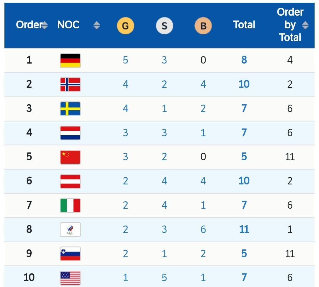 По итогам шестого дня зимней Олимпиады в Пекине первое место в общекомандном зачете заняла Германия - 5 золотых медалей. Сборная России всё ещё лидирует по общему количеству завоеванных наград - 11 медалей.