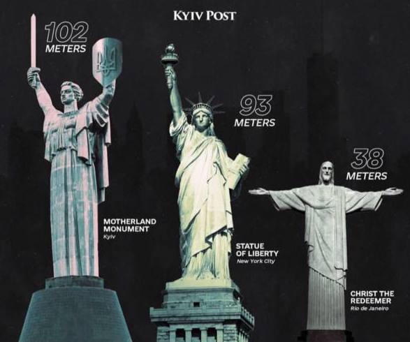 Батьківщина-Мати входить до ТОП-10 найвищих монументів у світі та є найвищим у Європі. Всупереч поширеній думці, київська Батьківщина-Мати – вища за Статую Свободи в Нью-Йорку. Загальна висота української пам'ятки становить 102 м, а американської статуї – 93 м.