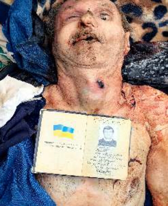 На фото вбиті ЗСУ громадяни України: Т. Масло (чотири вогнепальних поранення, сліди катування) і С. Смелєв (вогнепальне поранення, вхідний отвір на шиї, слід від опіку, стріляли з відстані декількох сантиметрів).