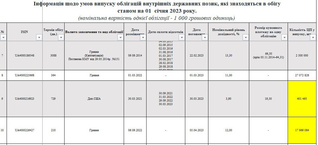 Що точно зрозуміло - це те, що уряду внутрішні запозичення завжди потрібні. Не лише на поточні бюджетні витрати, а й на погашення старих випусків держоблігацій. Наприклад, за два тижні, 30 березня, його чекає велике погашення доларових ОВДП - на $401,5 млн. А вже 4 квітня потрібно буде виплатити майже 18 млрд грн за гривневими паперами. За раз влада зараз стільки не збирає. При цьому, як відомо, Мінфіну не може більше допомагати з фінансуванням Нацбанк, який у меморандумі з МВФ зобов'язався згорнути емісію гривні 2023 року і більше не викуповувати держоблігації Кабміну (2022 року придбав їх на 400 млрд грн).