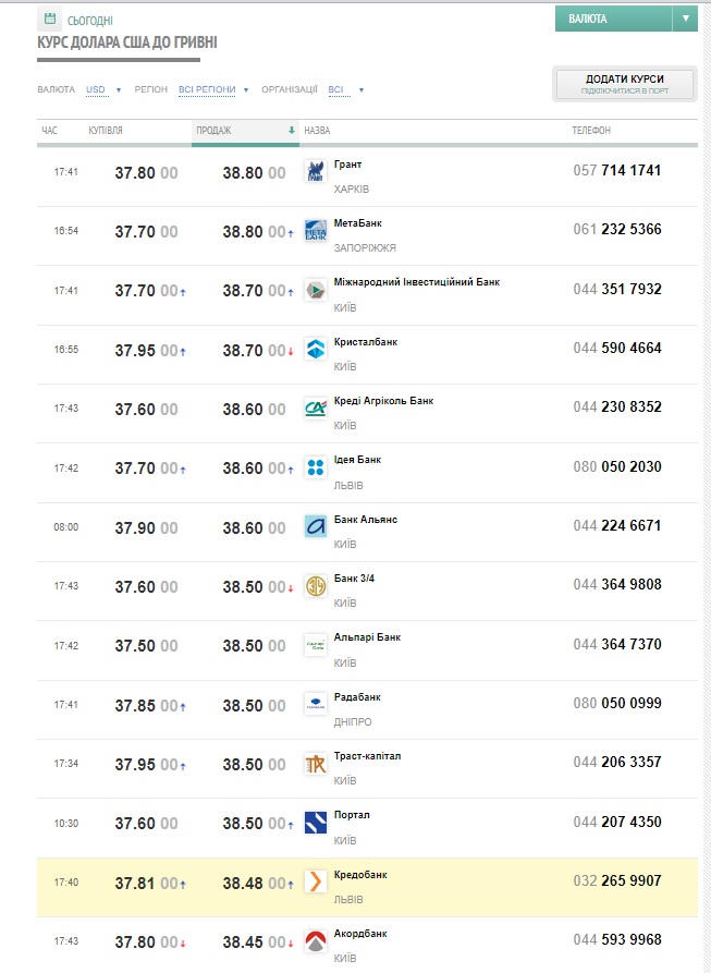 Помітно стримали свої апетити банки, які вже не ставили в касах, як учора, цінник у 39,2 грн/$. Середня вартість готівкового долара у відділеннях на продажі людям перебувала в межах 37,85-38,70 грн/$, а максимальна стояла на 38,80 грн/$і її дотримувалися "МетаБанк" та банк "Грант". Викуп відбувався у межах 36,60-38,05 грн/$.