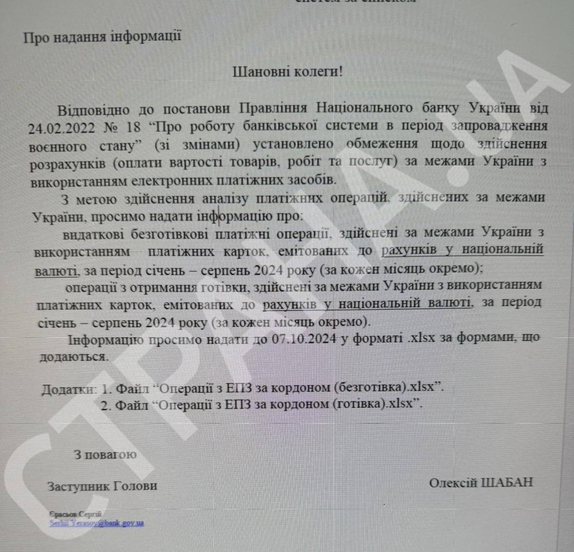 НБУ вимагає інформації про фактичні обсяги таких транзакцій у помісячному розрізі з січня по серпень 2024 року. Банки зобов'язані надати відомості до 7 жовтня, що всі, напевно, і зроблять.