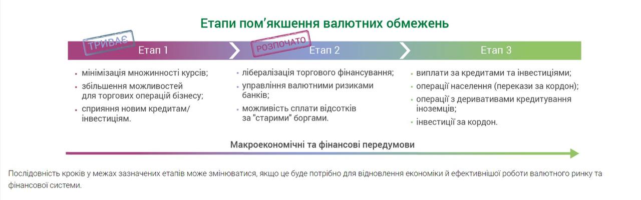 На офіційному сайті НБУ опубліковано приблизні етапи зняття валютних пом'якшень, без прив'язки до конкретних проміжків часу. Там валютні послаблення для населення віднесені до третього етапу, а регулятор поки що знаходиться на другому.
