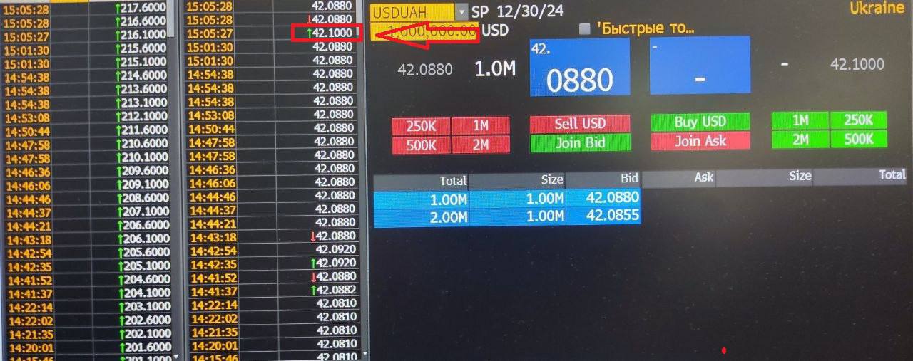 Сьогодні торги на основному майданчику міжбанку Bloomberg відкрилися на 41,97 грн/$, за годину досягли 42,05 грн/$, а після обіду вийшли на 42,092 грн/$. Після цього з ринку зникла пропозиція долара і було зафіксовано одну угоду на новому історичному максимумі 42,1 грн/$. Однак дилери Нацбанку швидко помітили цей рух і встановили свій курс продажу 42,088 грн/$, яким заливали ринок валютою. Остання угода дня на Bloomberg відбулася на 42,0855 грн/$.