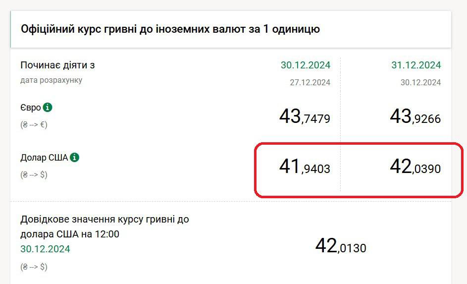 За підсумками дня Національний банк підняв свій офіційний курс у парі гривня/долар з 41,9403 грн/$до 42,0390 грн/$. Його встановлено на 31 грудня, останній день 2024 року. Це новий історичний максимум. До цього нацбанківський курс ще жодного разу не перетинав позначку 42 гривні, а попереднім максимум становив 41,99 грн/$(24 грудня).
