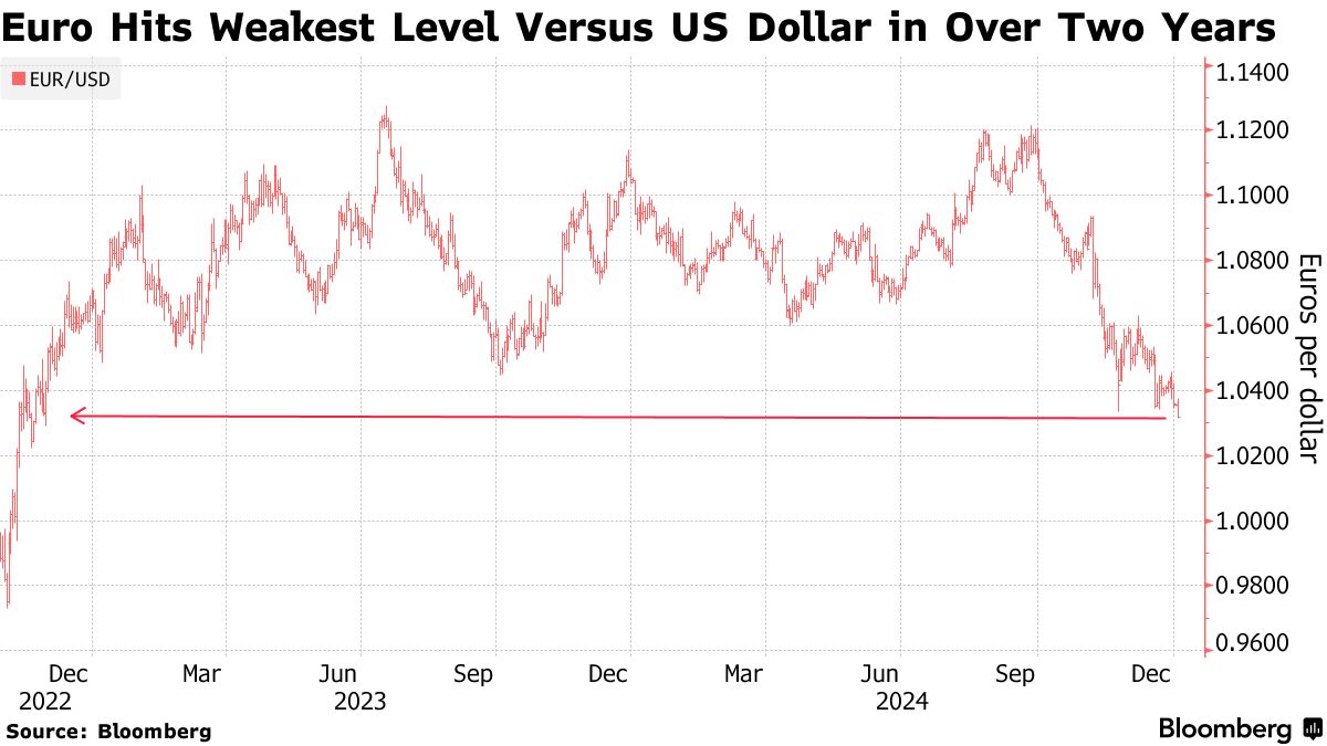 Багато експертів припускають цього року сповзання до паритету з доларом США чи навіть нижче. Востаннє цей ключовий психологічний поріг було подолано у 2022 році, після того, як повномасштабне вторгнення Росії в Україну спровокувало енергетичну кризу в Європі та спровокувало побоювання рецесії.
