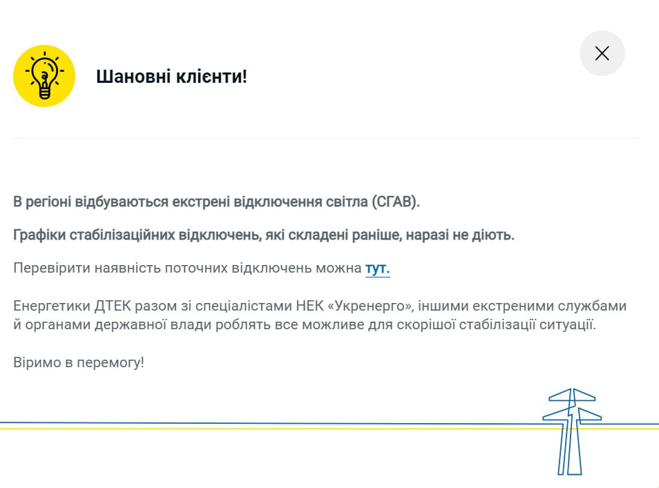 На Дніпропетровщині діють екстрені відключення світла, стабілізаційні графіки не діють.
