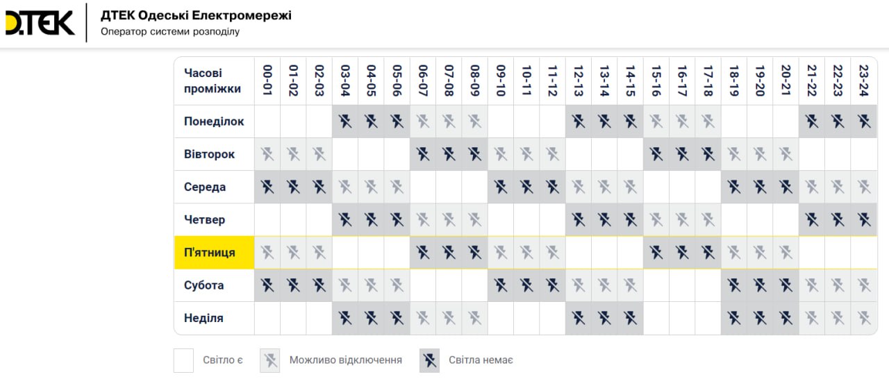 У Києві та Одесі йдуть відключення за графіками. Кияни, як і раніше, отримують 2 години гарантованого світла, 3 години ймовірних та 4 години обов'язкових відключень, одесити – 3 години гарантованої електроенергії, 3 ймовірні та 3 години обов'язкових відключень, свідчить інформація на регіональних сайтах ДПЕК.