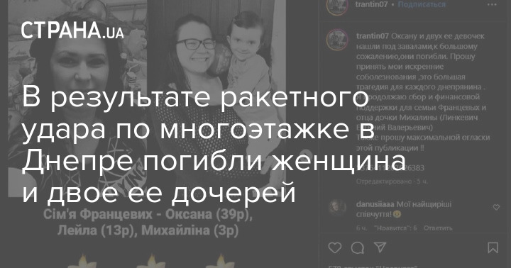 З'являються нові подробиці про жертви руйнування багатоповерхівки в Дніпрі. Так, стало відомо, що через влучення ракети у житловий будинок загинула родина Францевих - 39-річна Оксана та дві її дочки: тринадцятирічна Лейла та трирічна Михайліна.