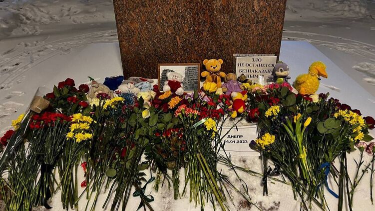 На фото також видно табличку "Дніпро 14.01.23", серце квітів українського прапора та напис "Зло не залишиться безкарним".