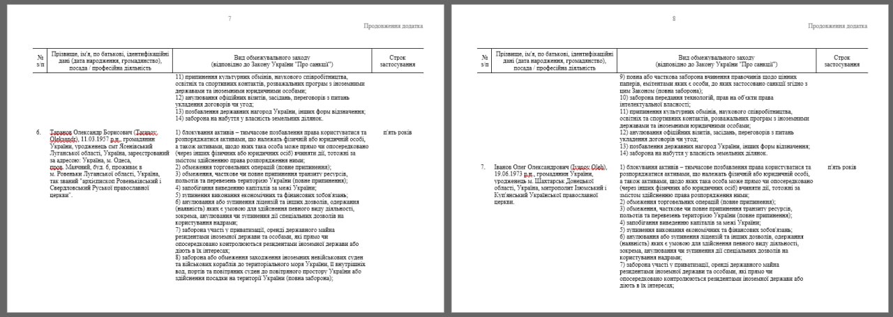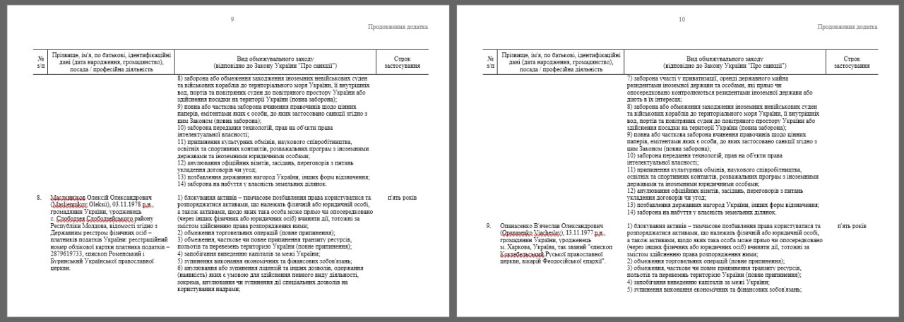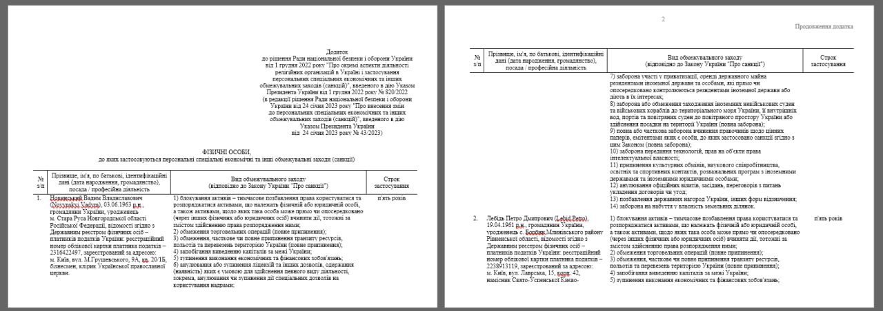 Президент України Володимир Зеленський ввів у дію рішення РНБО щодо санкцій проти нардепа Вадима Новинського, настоятеля Києво-Печерської Лаври митрополита Павла та низки представників церкви.