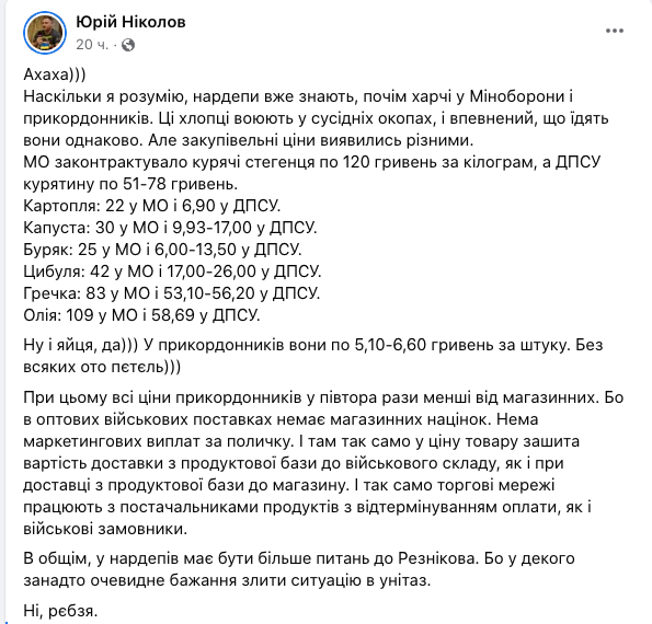"Всі ціни прикордонників у півтора рази менші за магазинні. Бо в оптових військових поставках немає магазинних націнок. Немає маркетингових виплат за поличку. І там так само в ціну товару зашита вартість доставки з продуктової бази до військового складу, як і при доставці з продуктової бази магазин", - написав він.
