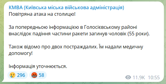 У Київській міській військовій адміністрації уточнили, що 55-річний чоловік у Голосіївському районі загинув, за попередньою інформацією, внаслідок падіння частини ракети.