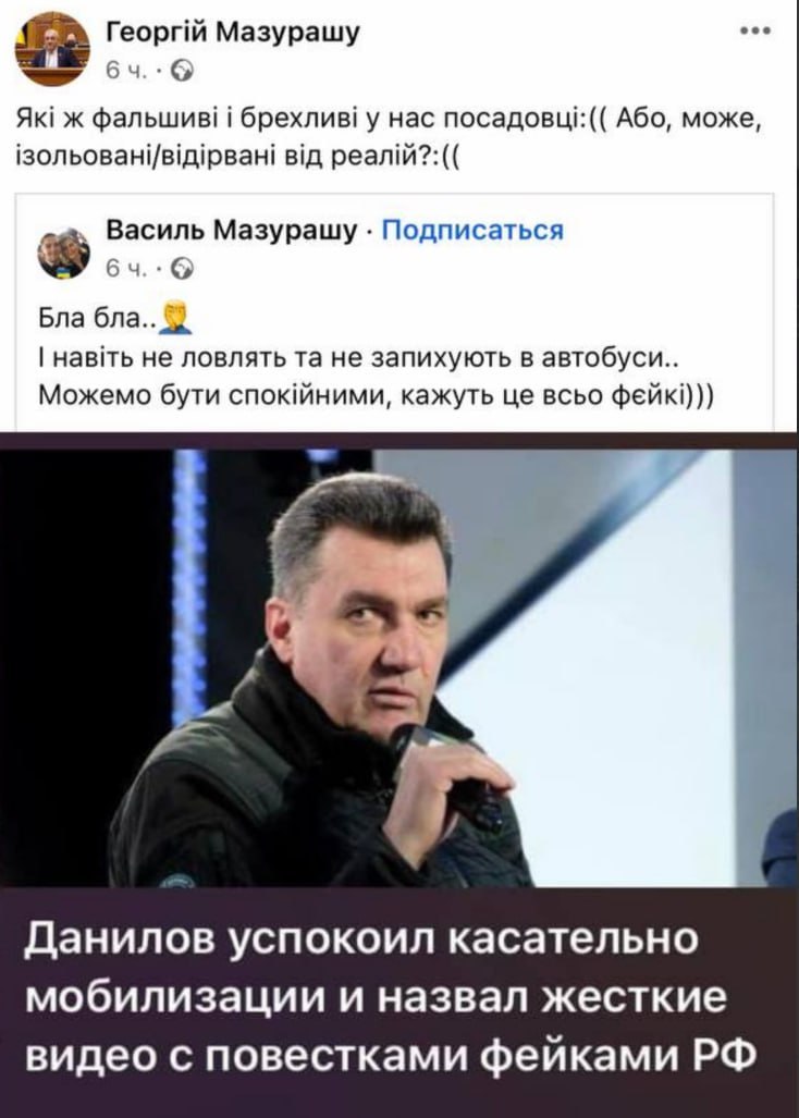 Так нардеп підписав у себе на сторінці у Facebook скріншот новини із заголовком "Данілов заспокоїв щодо мобілізації та назвав жорсткі відео з повістками фейками РФ".