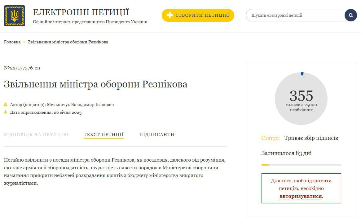"Негайно звільнити з посади міністра оборони Резнікова, як посадової особи, далекої від розуміння, що таке армія та її обороноздатність, нездатність навести лад у Міністерстві оборони та спроби прикрити небачені розкрадання коштів з бюджету міністерства викритого журналістами", - йдеться у петиції.