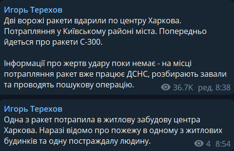 Пізніше Терехов додав, що одна з ракет потрапила по житловій забудові в центрі Харкова. Зараз відомо про пожежу в одному з житлових будинків та одну постраждалу людину.