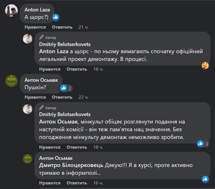 Він повідомив, що поки що невирішеним залишається питання демонтажу пам'ятників Олександру Пушкіну та командиру Миколі Щорсу.