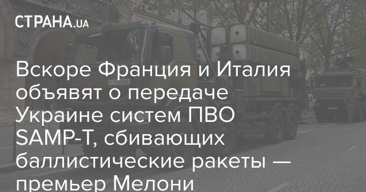 Прем'єр-міністр Італії Джорджія Мелоні підтвердила, що Рим та Париж відправлять Києву системи ППО SAMP-T, про що французькі ЗМІ повідомляли наприкінці січня.