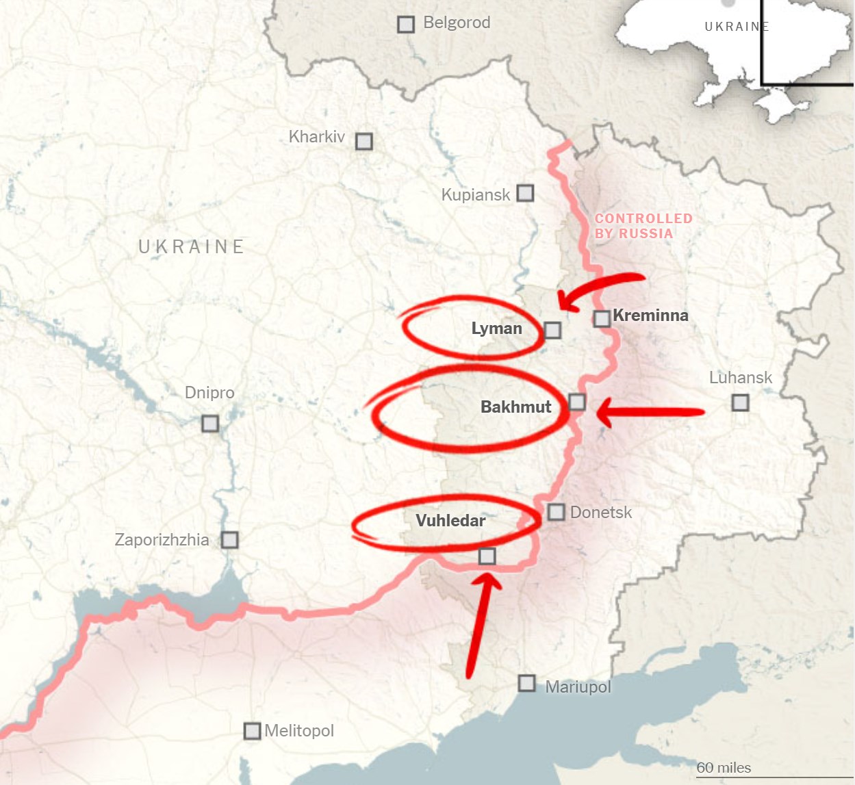 Росіяни передусім наступатимуть на сході, де сподіваються здобути символічну перемогу, вигнавши українців із Бахмута. Також вони прагнуть убезпечити лінії постачання, які матимуть вирішальне значення для будь-якого їхнього успіху в Україні.