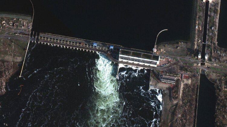 Вода йде бурхливим потоком через шлюзові затвори гідроелектростанції, яку контролює російські війська. В результаті супутникові знімки показують, що рівень води у водосховищі впав до найнижчої позначки за 30 років.