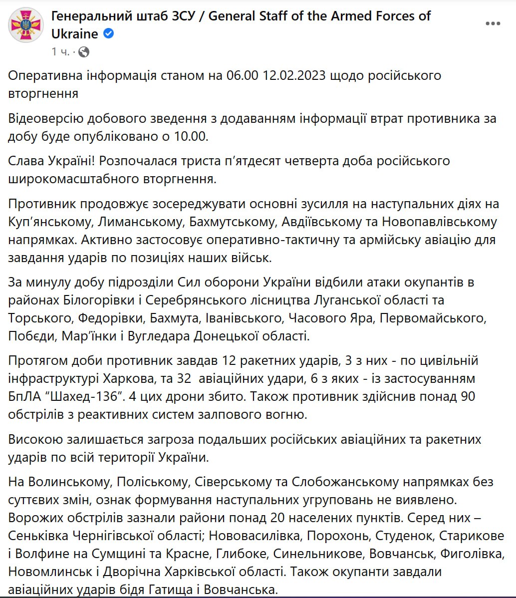 08:12 Зведення українського Генштабу на ранок 12 лютого. Головне: