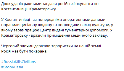 Глава Донецької ОВА Павло Кириленко підтверджує ракетні удари по Костянтинівці та пише про прильоти у Краматорську, де противник вразив приміщення медичного закладу.