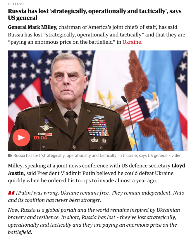 "Росія розв'язує війну на виснаження, а Україна використовує асиметричні переваги. І найважливіші такі переваги – це мужність, витривалість та тактична кмітливість. Дана війна розгортається дуже динамічно. Україна веде військові дії, одночасно продовжуючи підготовку нових кадрів, використовуючи нові БТР, БМП та танки. Росія не зможе пересидіти український народ або його партнерів по НАТО. Якщо коротко, Росія програла на стратегічному, оперативному та тактичному рівні. І платить за це величезну ціну на полі бою", - заявив Міллі на спільній прес-конференції з міністром оборони США Остіном у Брюсселі.