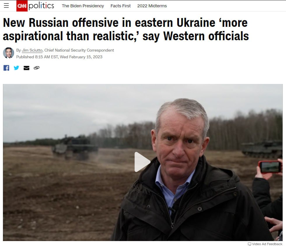 09:48 Російським військовим потрібен час до травня, щоб відновити потенціал для наступу, але через політичний тиск з боку Кремля наступ може початися раніше, ніж російські війська будуть готові, заявив CNN високопоставлений військовий представник США.