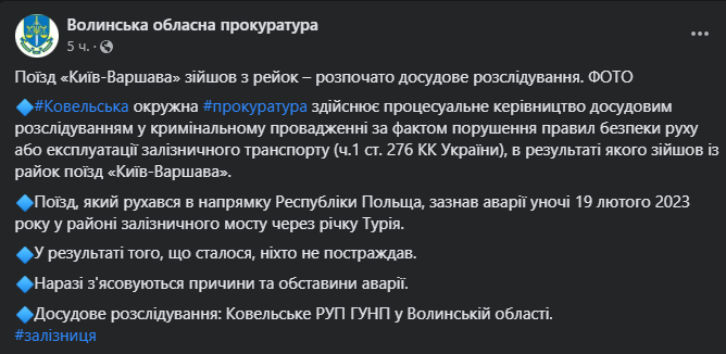 Потяг, який рухався у напрямку Польщі, зазнав аварії вночі 19 лютого 2023 року в районі залізничного мосту через річку Турія. Постраждалих немає.