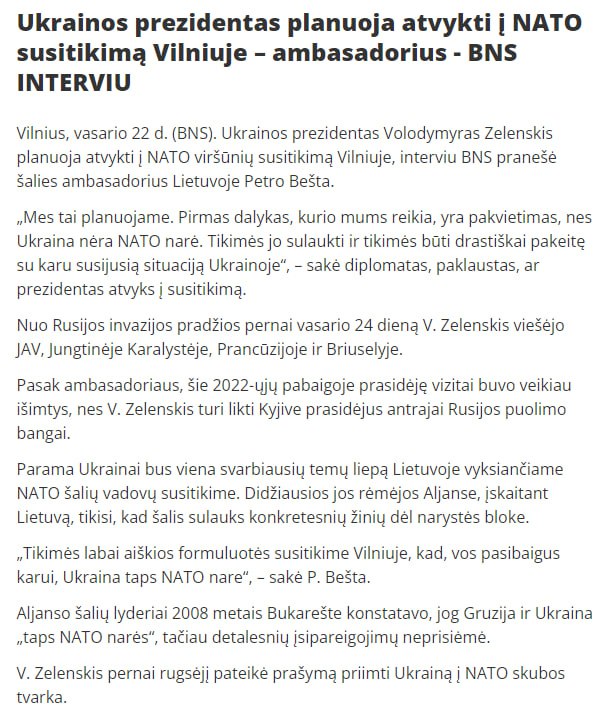 "Ми це плануємо. Перше, що нам потрібне, це запрошення, тому що Україна не є членом НАТО. Сподіваємося його отримати і сподіваємося, що кардинально змінили ситуацію, пов'язану з війною в Україні", - сказав Бешта.