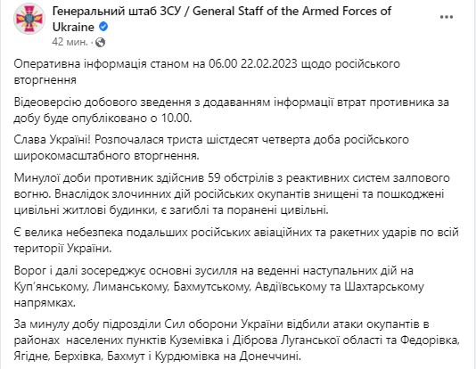 Зведення Генштабу ЗСУ станом на 18:00 22 лютого 2023 року