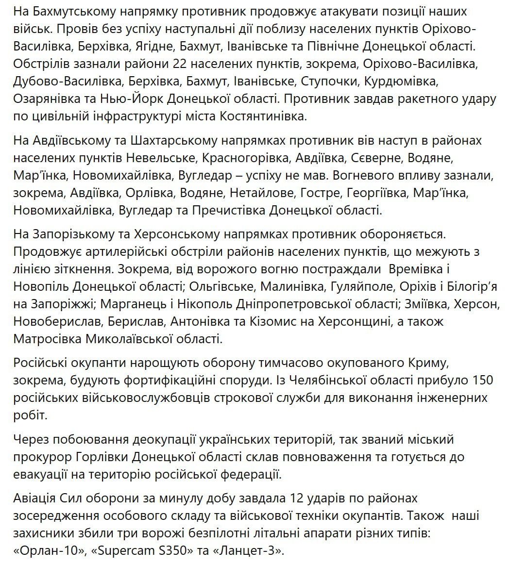 - На Бахмутському напрямку РФ продовжує безуспішно атакувати поблизу населених пунктів Оріхово-Василівка, Берхівка, Ягідне, Бахмут, Іванівське та Північне Донецької області. Обстрілів зазнали райони 22 населених пунктів, зокрема, Оріхово-Василівка, Дубово-Василівка, Берхівка, Бахмут, Іванівське, Ступочки, Курдюмівка, Озарянівка та Нью-Йорк Донецької області. Противник завдав ракетного удару по цивільній інфраструктурі міста Костянтинівка.