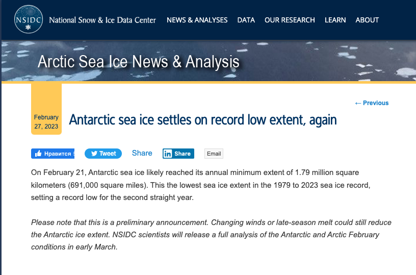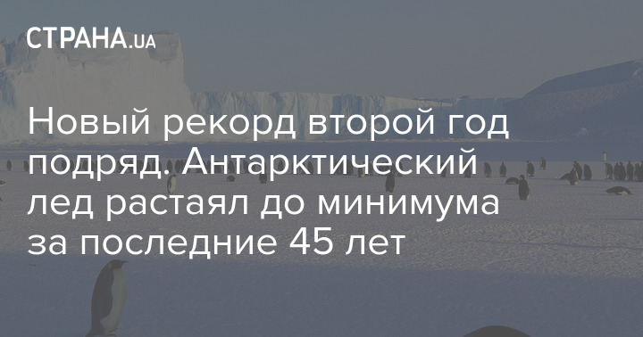 Антарктичний морський лід розтанув до мінімуму за останні 45 років - до 1,79 млн. квадратних км. При цьому антирекорд встановлюється другий рік поспіль.