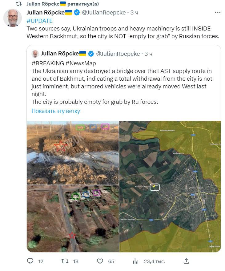 14.05 Відео Пригожина, на якому він заявляє про практично повне оточення Бахмута, насправді записано в селі Парасковіївка на північ від Бахмута, заявляє український Центр національного спротиву, проаналізувавши фон на відео Пригожина та зіставивши його з картами.
