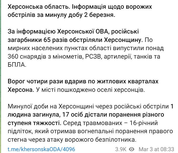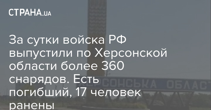 За добу війська РФ випустили по Херсонській області понад 360 снарядів. Є загиблий, 17 людей поранено