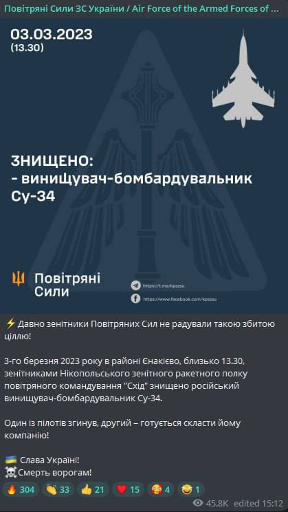 За даними Повітряних сил ЗСУ у Facebook, російський Су-34 збили зенітники Нікопольського зенітного ракетного полку Повітряного командування "Схід" біля окупованого Єнакієвого близько 13.30.