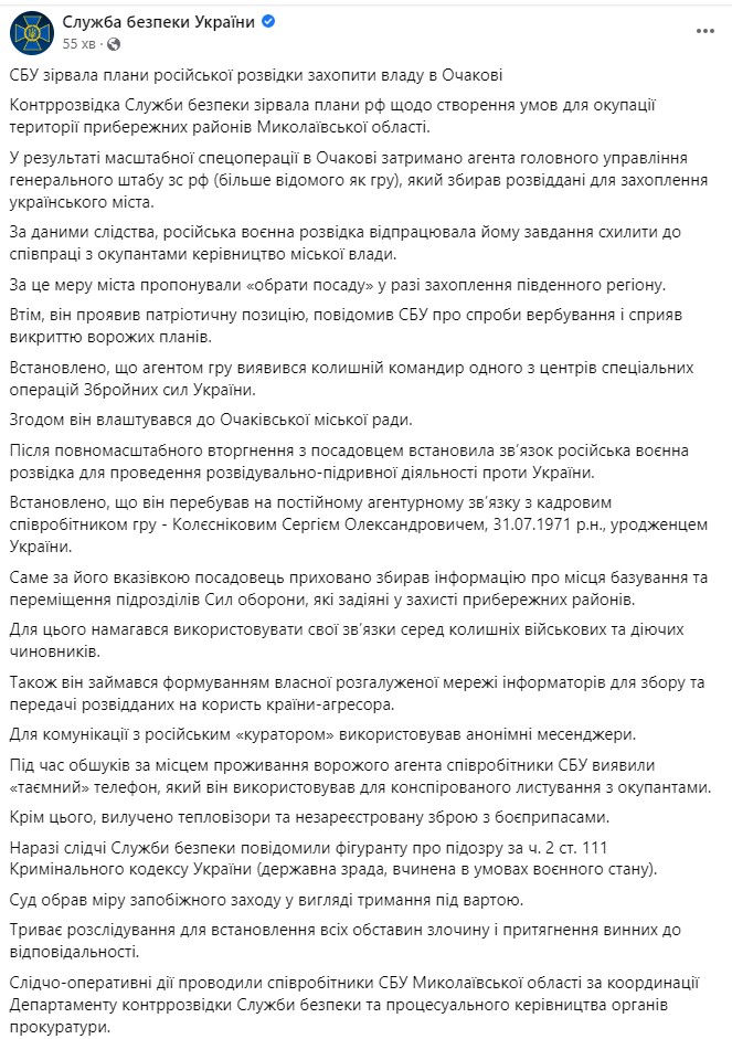 Встановлено, що агент ГРУ в Очакові перебував на зв'язку із кадровим співробітником військової розвідки Росії Сергієм Колесніковим, уродженцем України.