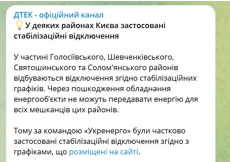 У Києві почали відключати світло у частині Голосіївського, Шевченківського, Святошинського та Солом'янського районів. Стабілізаційні відключення вводяться через пошкоджене внаслідок ракетного обстрілу обладнання.