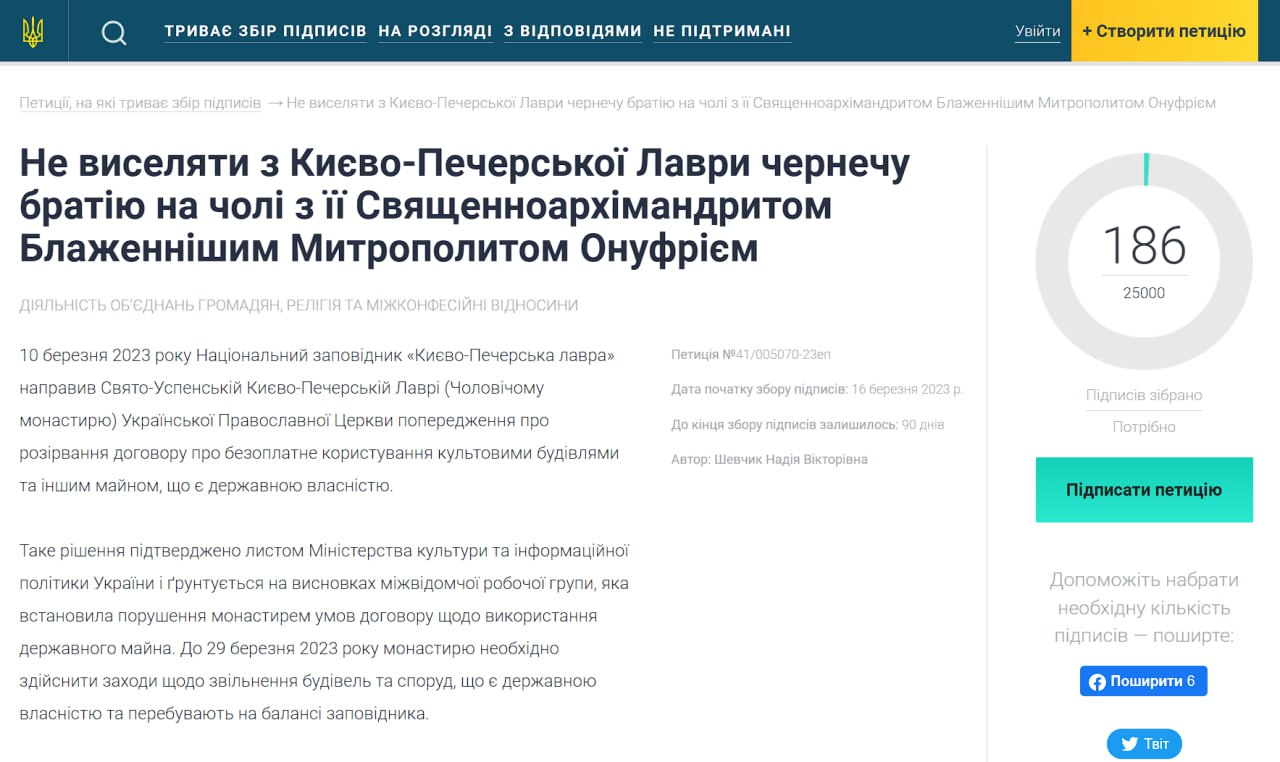 "Нинішні мешканці Лаври ще 1988 року переступили її поріг у радянський репресивний час і відновили святиню з руїн. Багато хто з них поклав на це своє життя та здоров'я. Брутальне виселення лаврських ченців – це акт величезної несправедливості", - йдеться у петиції.