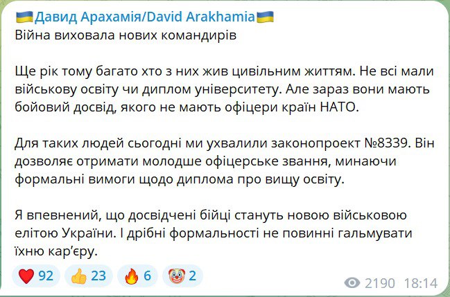 "Війна виховала нових командирів. Ще рік тому багато хто з них жили цивільним життям. Не всі мали військову освіту чи диплом університету. Але зараз вони мають бойовий досвід, якого не мають офіцери країн НАТО. Для таких людей сьогодні ми ухвалили законопроект №8339. Він дозволяє отримати молодше офіцерське звання, минаючи формальні вимоги щодо диплому про вищу освіту", - пише Арахамія.