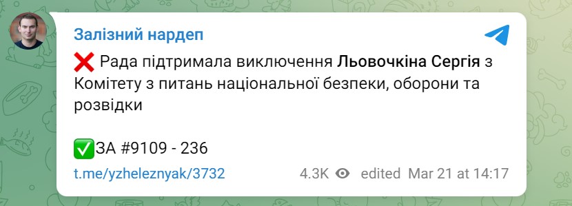 Про це повідомив нардеп Ярослав Железняк у телеграм-каналі.