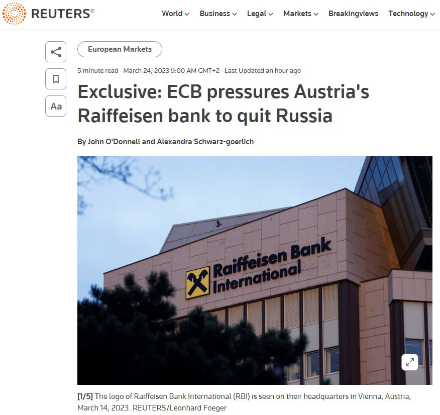 Центробанк ЄС вимагає від Raiffeisen Bank піти з Росії. Тиск виник після того, як високопосадовець США із санкцій висловив стурбованість з приводу бізнесу Райффайзен до РФ під час візиту до Відня минулого місяця.
