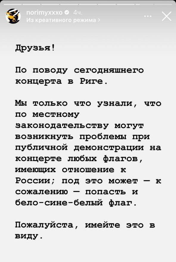 Як повідомляє телеграм-канал SOTA, молоду людину з альтернативним (біло-червоно-білим) прапором Білорусі змусили прибрати прапор і дозволили повернутися на захід лише без нього. Як написав у сторіс Інстаграма сам Оксимирон, згідно з вимогами влади, не можна демонструвати прапори, які стосуються Росії. Навіть біло-синьо-білий прапор російської опозиції. "Яке відношення прапор республіки Білорусь має до російської символіки - неясно", - пише SOTA.