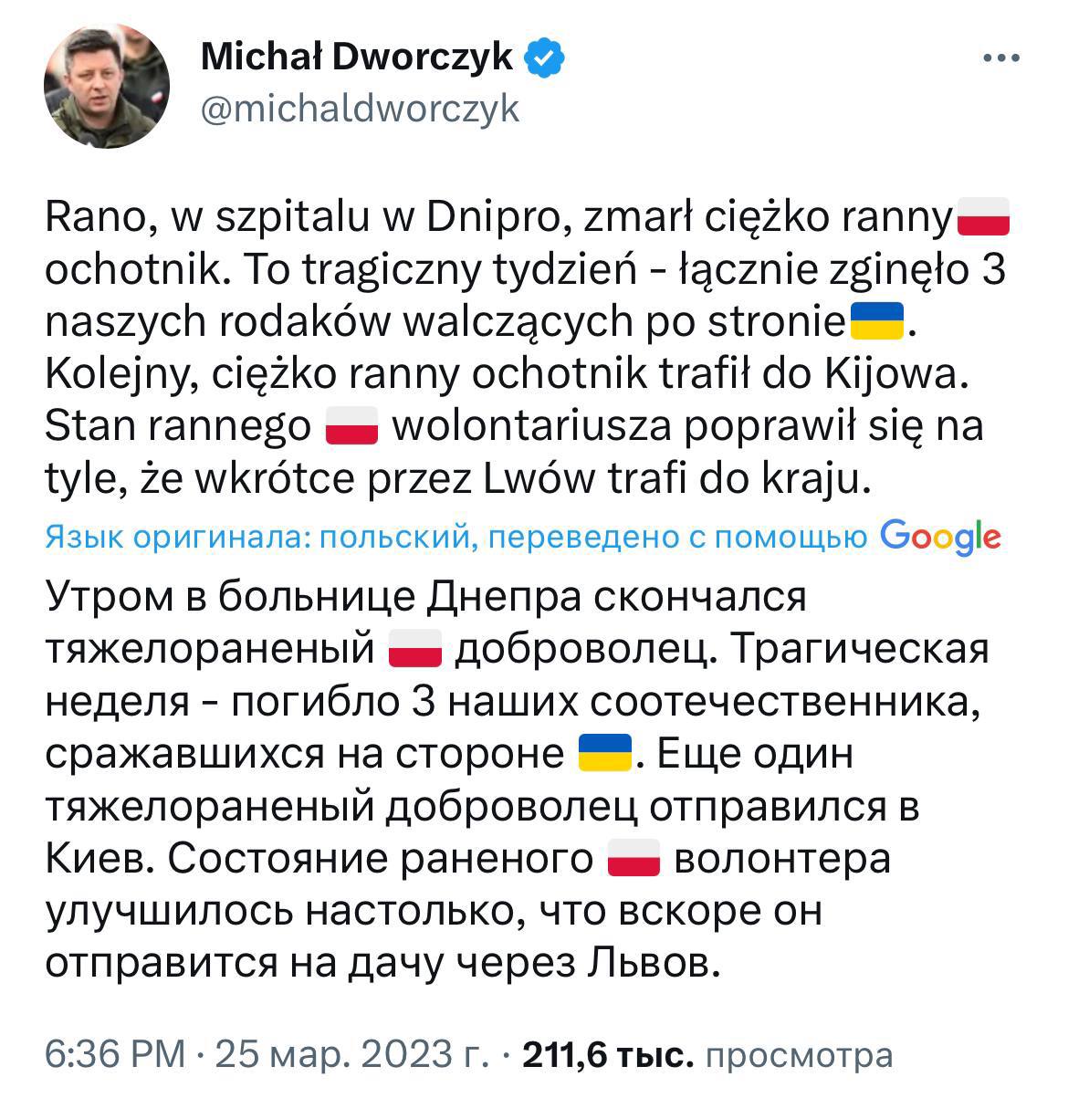 "Вранці (пост був написаний вчора - Ред.) у лікарні Дніпра помер тяжко поранений польський доброволець. Трагічний тиждень - загинуло 3 наших співвітчизників, які билися на боці України. Ще один тяжко поранений доброволець вирушив до Києва", - написав Міхал Дворчик.
