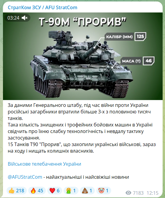 У числі захоплених у росіян танків є 15 танків Т-90 "Прорив". Т-90М - один із найсучасніших російських танків, що розробляється з початку нульових.