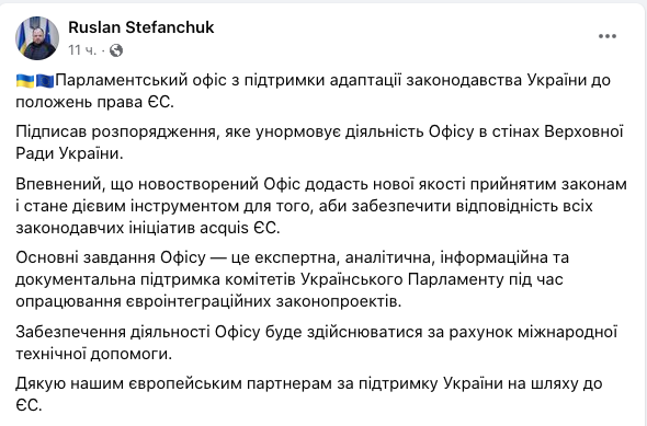 "Тепер кожен комітет українського парламенту стає, по суті, євроінтеграційним. Кожна законодавча ініціатива розглядатиметься через призму її відповідності тим чи іншим європейським нормам. І це має стати новою архітектурою українського парламентаризму", - повідомляв Стефанчук.