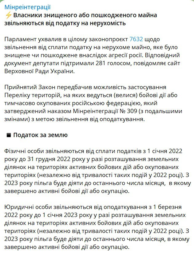 Від сплати податку за землю за 2022 рік звільняються всі, чиї ділянки перебували на територіях бойових дій чи окупованих територіях. 2023 року пільга діятиме до кінця місяця, під час якого завершилися бої або окупація.