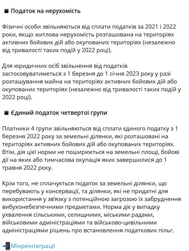 За єдиним податком четвертої групи: звільняються від сплати всі, чиї земельні ділянки на територіях, де велися або ведуться бойові дії після 1 травня 2022 року, а також ті, що знаходяться на територіях, які були або залишаються окупованими після 1 травня 2022 року.