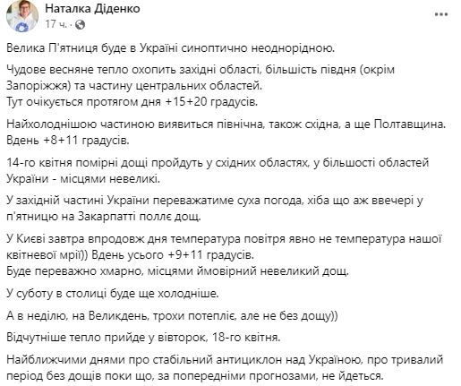 Синоптик Наталія Діденко написала, що погода у п'ятницю буде неоднорідною. Весняне тепло охопить західні області, більшість півдня (крім Запоріжжя) та частину центральних областей. Очікується протягом дня +15...+20.