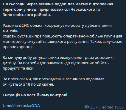 Також у сусідній Черкаській області підтоплено села Черкаського та Золотоніського районів, повідомив губернатор Ігор Табурець.